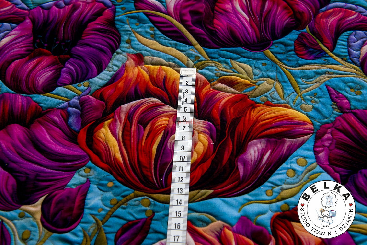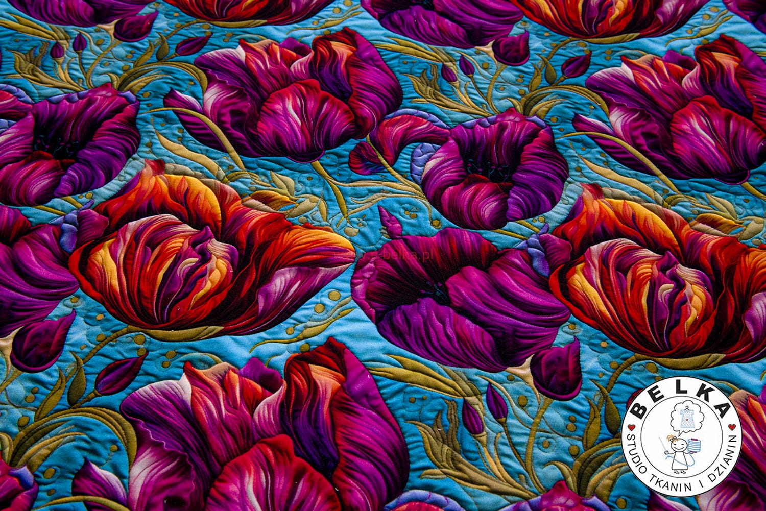 DZIANINA JERSEY CYFROWY TULIPANY NA TURKUSIE
