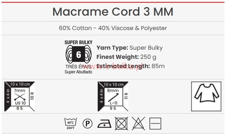 Sznurek YarnArt Macrame Cord 3mm nie posiada rdzenia i jest skręcony z wielu cienkich nitek. Nadaje się do rozczesywania i polecany jest na poduchy, pledy, kosze czy dywany.