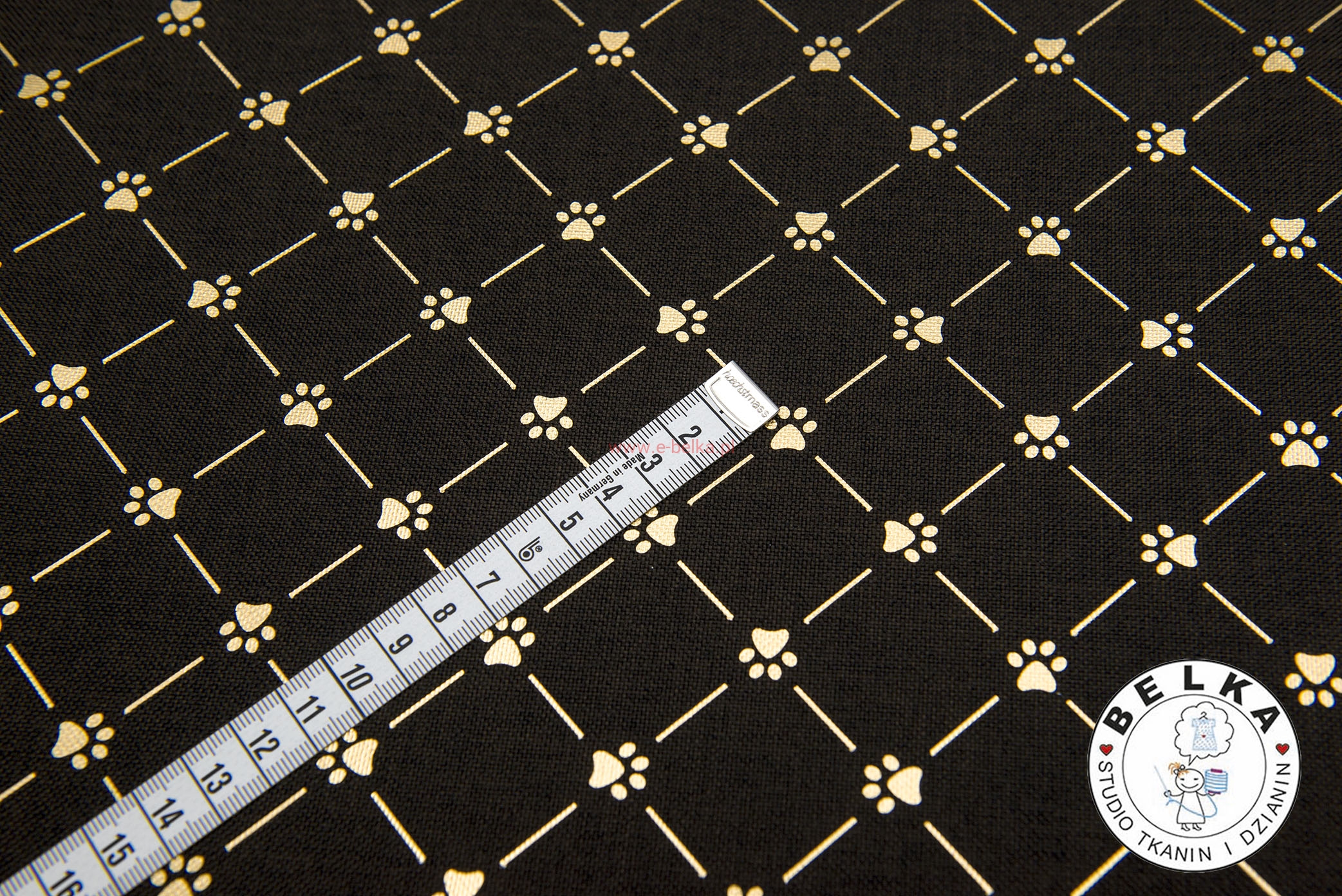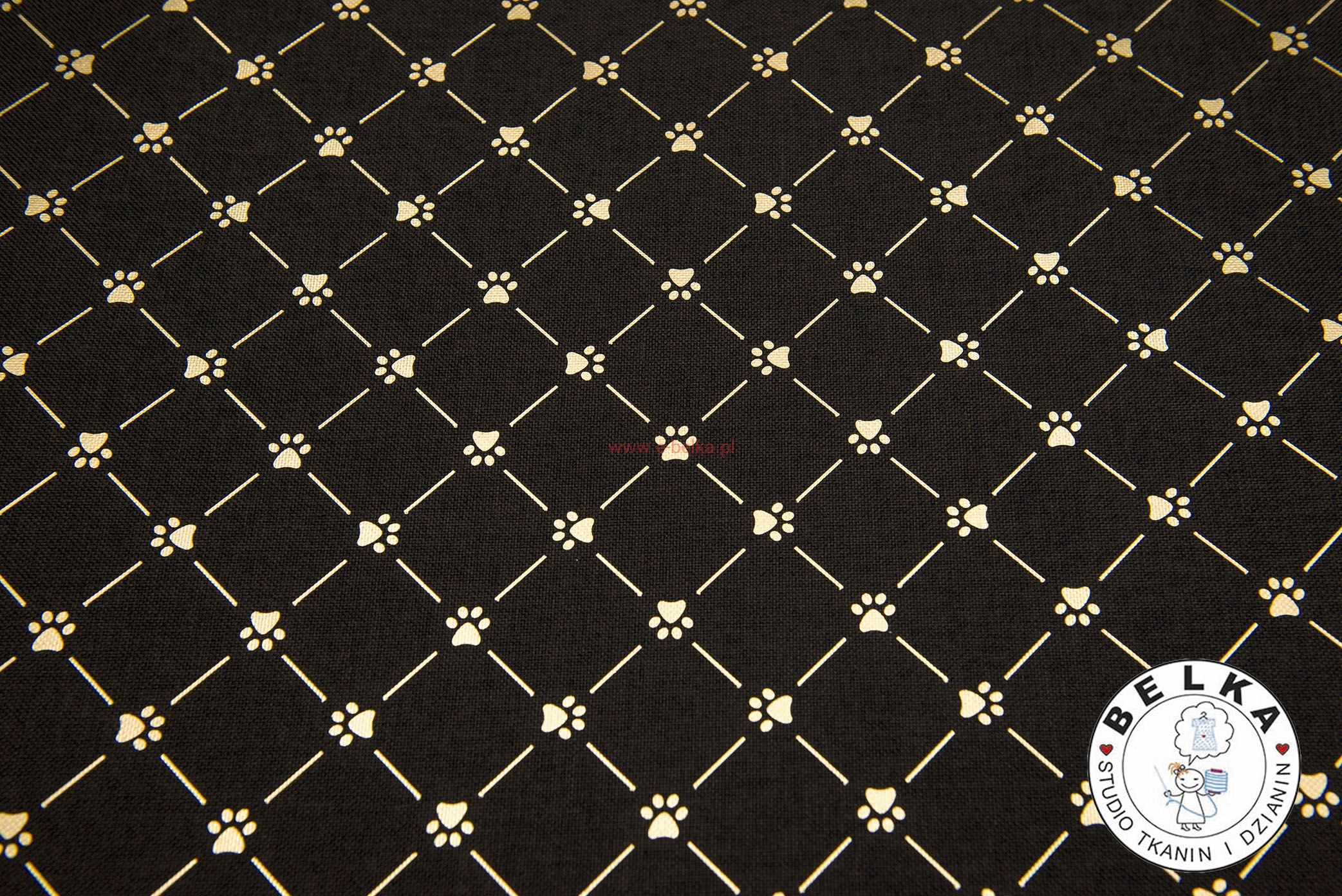 TKANINA WODOODPORNA OX WZÓR LEN BRĄZ ŁAPKI ZŁOTO