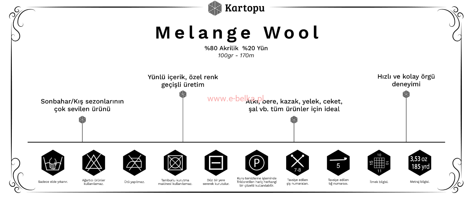 Mieszanka wełny i akrylu bardzo miła i miękka w dotyku, lekki skręt nitki powoduje że wyroby są lekkie i ciepłe jednocześnie. Doskonale sprawdzi się na czapki, kominy, poncza oraz swetry. Dzięki swojej miękkości delikatności nadaje się również na wyroby dla dzieci.