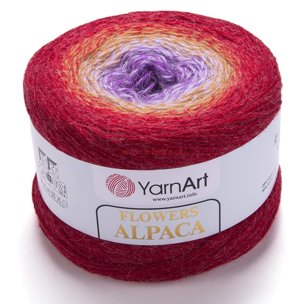 Włóczka Flowers Alpaca z efektem Ombre. Delikatna i ciepła mieszanka akrylu i wełny alpaka w przepięknych zestawach kolorystycznych. Miękka i delikatna odporna na mechacenie. Poprzez skręt 4 nitek uzyskana jest łagodna zmiana koloru, dzięki czemu można stworzyć fantastyczne i niespotykane wyroby: chusty, sweterki, szale.