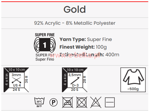 - Skład: 92% akryl 8% nić metaliczna poliestrowa